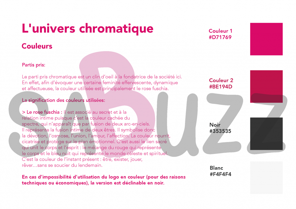 Créée et représentée par une femme, la société prône des valeurs féministes, humaines et engagées. Le lien créatrice/entreprise est inévitablement à prendre en compte dans le design visuel de la société : personnalité, valeurs, expertises… .